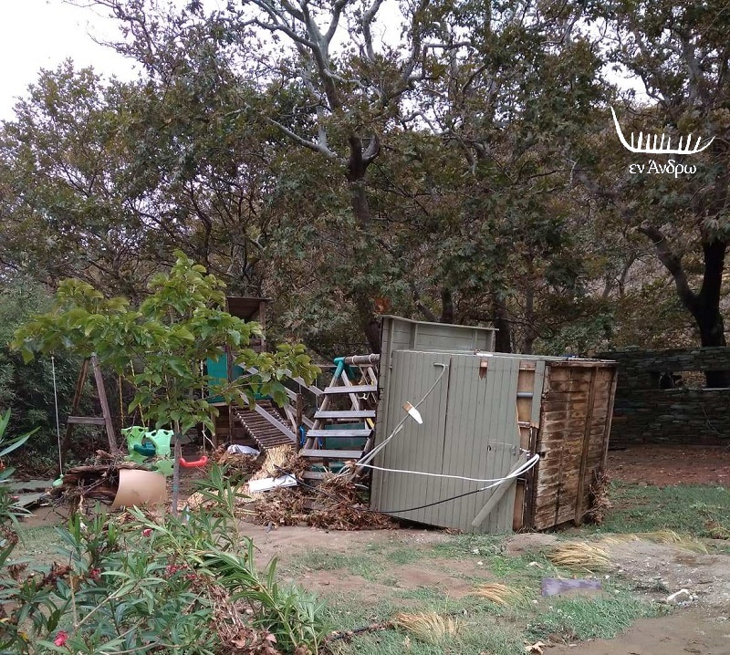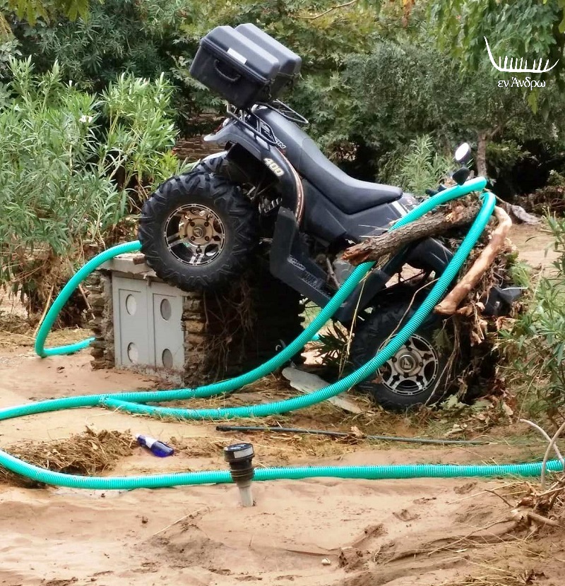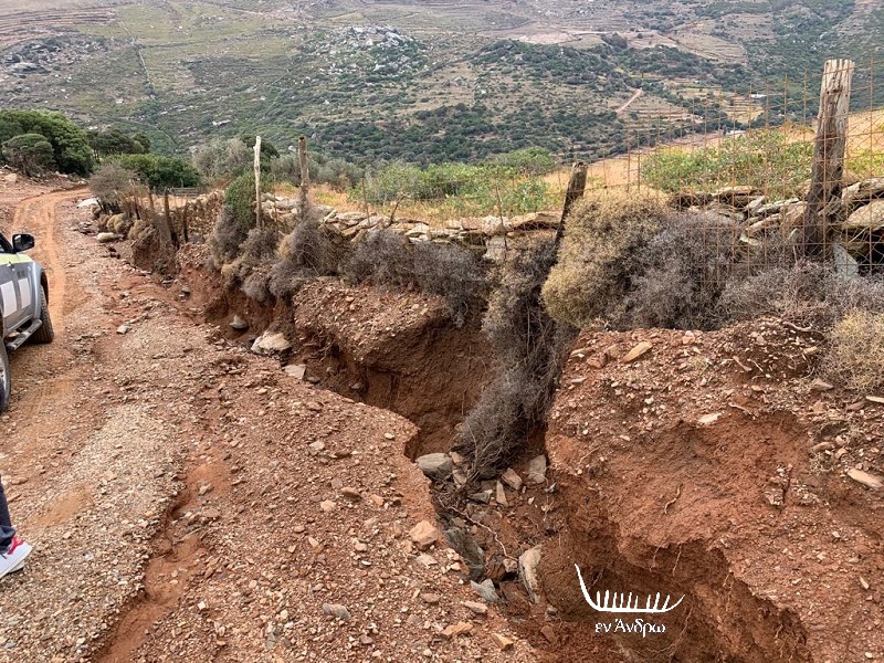 Λεπτομέρεια από την παραπάνω φωτογραφία. Ένα νέο ρέμα άνοιξε πλάι στον δρόμο! Ο χωματόδρομος για τα Άχλα σε μεγάλο βαθμό καταστράφηκε και μηχάνημα του Δήμου Άνδρου δούλεψε για να τον αποκαταστήσει.