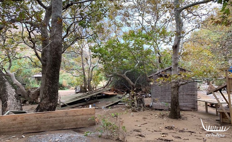 Το υπαίθριο μπαρ του ξενοδοχείου Όναρ. Ήταν τόση η δύναμη του νερού που ο κόλπος στα Άχλα γέμισε κορμούς δέντρων και ξύλα!