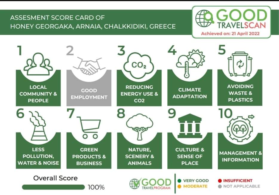Η επιχείρηση Μέλι Γεωργάκα, κρίθηκε 100% sustainable, και αμέσως μετά από τον έλεγχο εκδόθηκε και η σχετική score card. Η Score Card του προγράμματος Good Travel Scan, αποτελεί μια αξιόπιστη βεβαίωση και διάκριση για όσες επιχειρήσεις λάβουν υψηλό σκορ βαθμολογίας, ότι είναι sustainable.