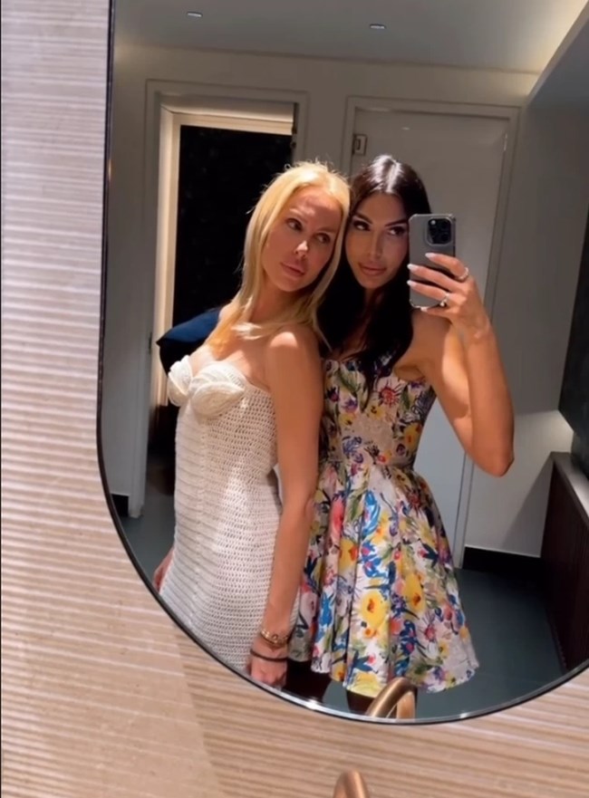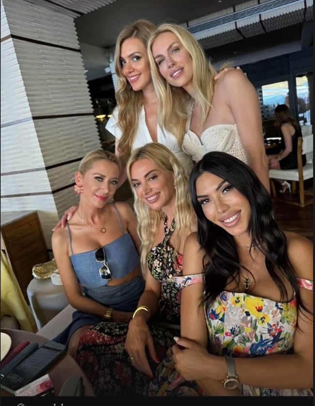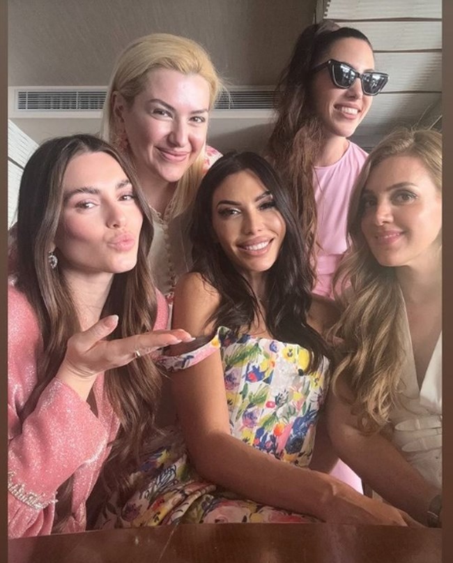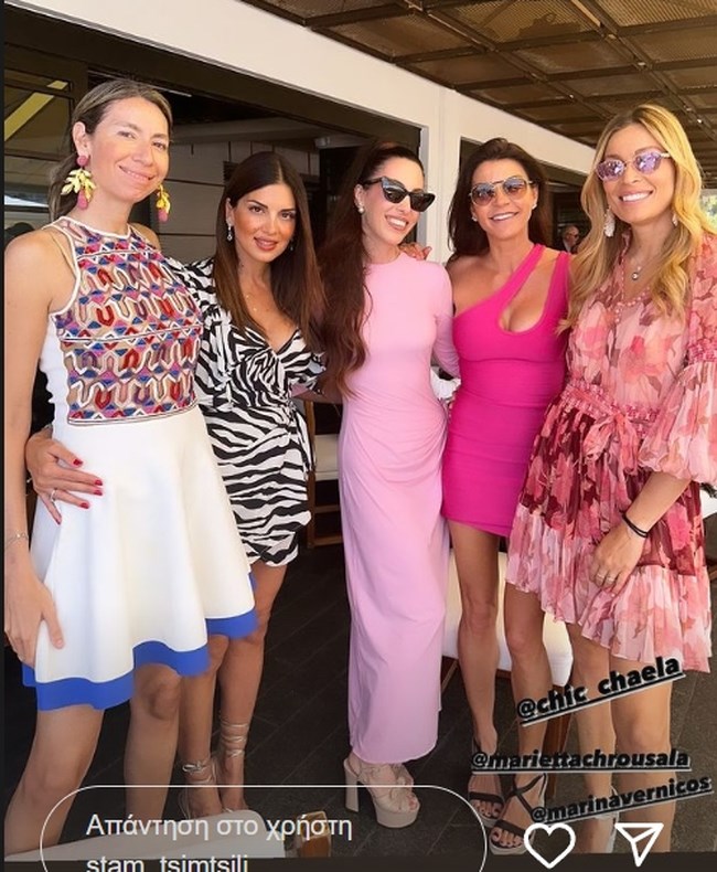 Πολλές καλεσμένες φόρεσαν ροζ και φλοράλ, ενώ η Τσιμτσιλή έκανε τη διαφορά με ασπρόμαυρο animal print μίνι φόρεμα.