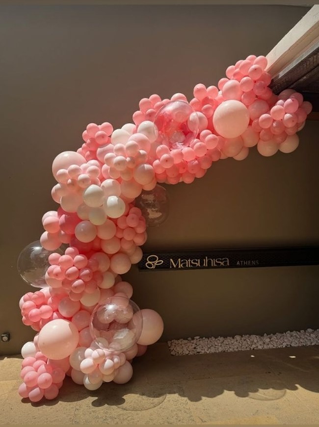 Η είσοδος του χώρου που φιλοξένησε τη δεξίωση είχε στολιστεί με μία αψίδα φτιαγμένη από ροζ μπαλόνια, ενώ τα ροζ μπαλόνια και τα λουλούδια κυριαρχούσαν στον στολισμό.